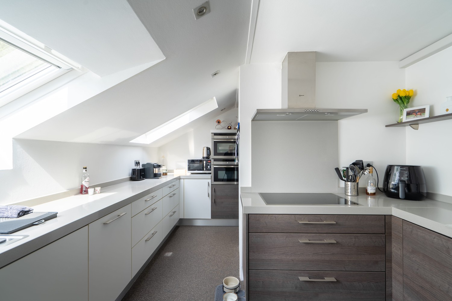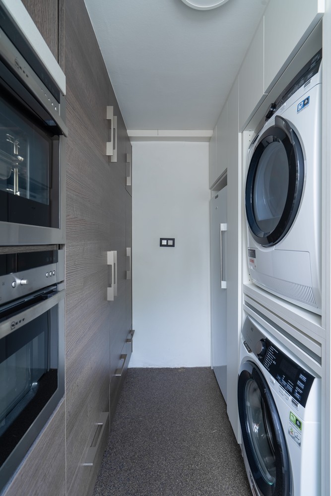 De verrassend grote keuken (16 m²) is kwalitatief ingericht met een duurzaam composiet werkblad, toestellen van NEFF (vaatwasser, combi-oven, diepvries en koelkast), een AEG-kookplaat en een extra tweede diepvries van Whirlpool.