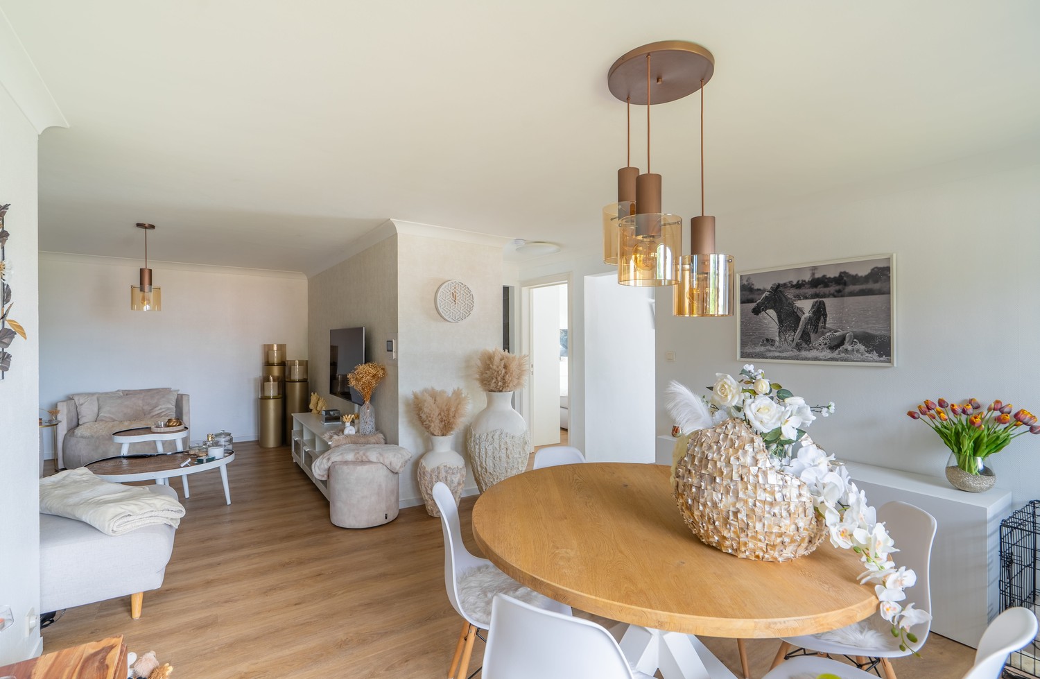 mooi en luxueus ingericht 1 slpk appartement op de eerste verdieping met terras, carport, prive kelder en een grote gemeenschappelijke tuin met lounge.